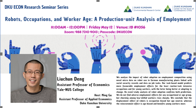 Bio: Liuchun Deng is an assistant professor of economics at Yale-NUS College. His research focuses on the labor market and productivity consequences of automation and international trade. He also works on the theory of economic dynamics with applications to development, political economy, and trade. He is currently an associate editor of Economics of Transition and Institutional Change. Liuchun Deng holds a Ph.D. in Economics from Johns Hopkins University.
