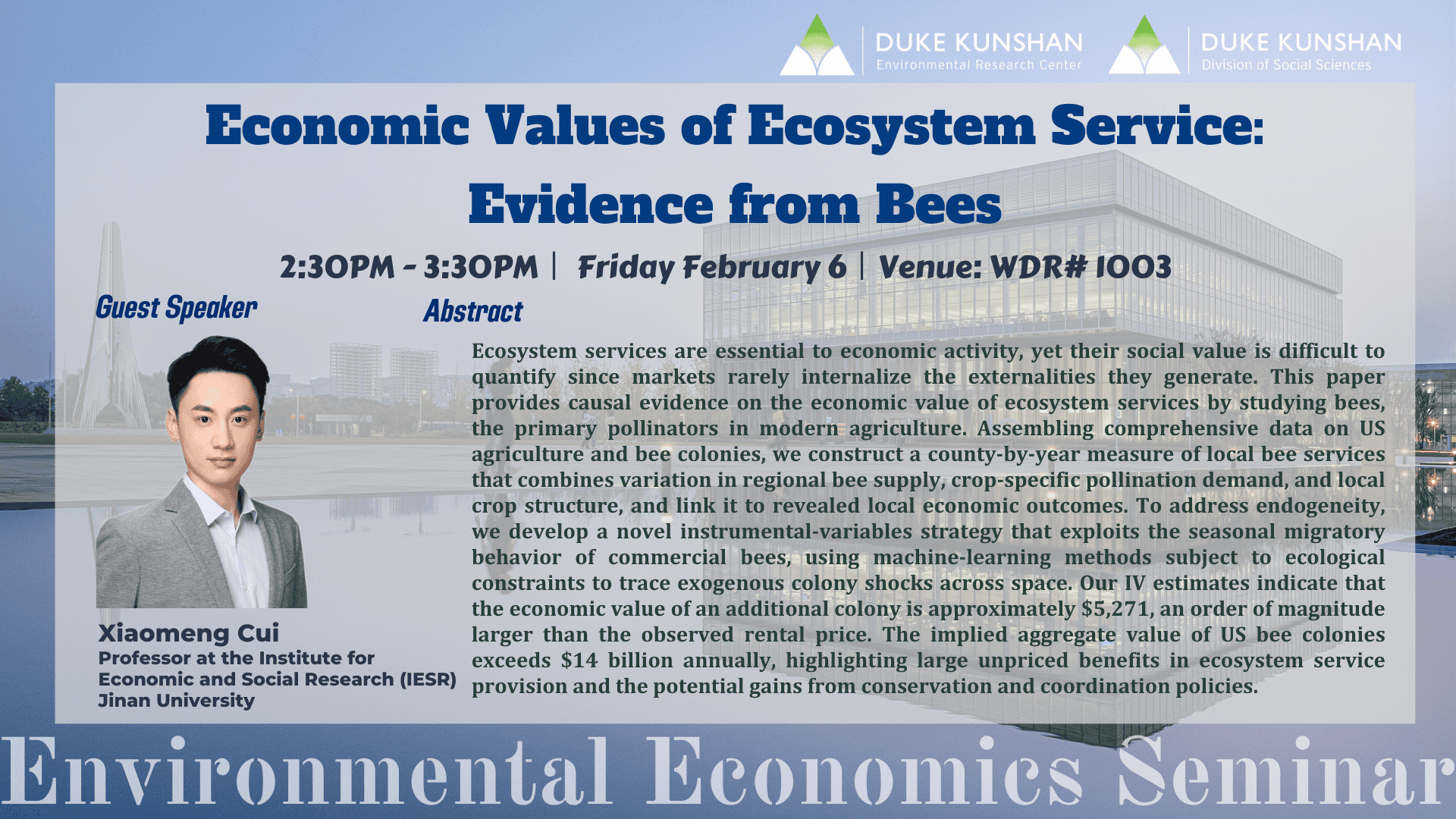 Speaker’s bio: Xiaomeng Cui is a Professor at the Institute for Economic and Social Research (IESR), Jinan University, Guangzhou, China. He is currently an Associate Editor of American Journal of Agricultural Economics, and serves on the Editorial Council of Journal of Environmental Economics and Management. His research fields include development, environmental, and agricultural economics. His recent papers have been published in Journal of Econometrics, Journal of Development Economics, Journal of Urban Economics, Journal of the Association of Environmental and Resource Economists, Journal of Environmental Economics and Management, and American Journal of Agricultural Economics.